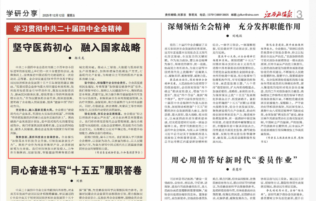 2025年12月12日,“江西省政協(xié)報(bào)”刊登了省政協(xié)常委、仁和集團(tuán)董事長楊文龍署名文章《堅(jiān)守醫(yī)藥初心 融入國家戰(zhàn)略》。該文章系楊文龍董事長于黨的二十屆四中全會勝利閉幕后,結(jié)合學(xué)習(xí)全會精神的體會感悟與企業(yè)自身發(fā)展情況所撰寫。